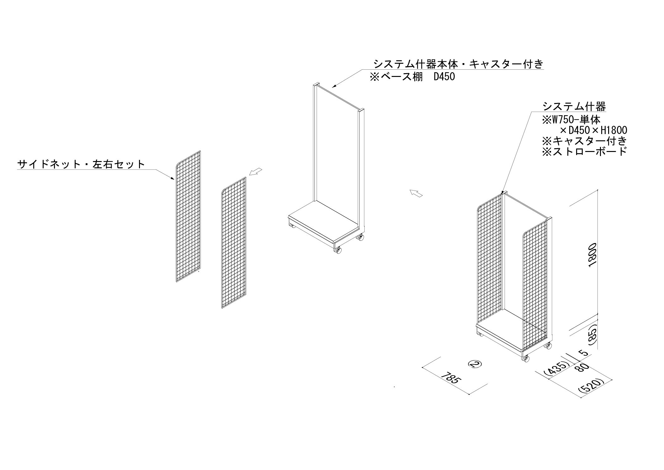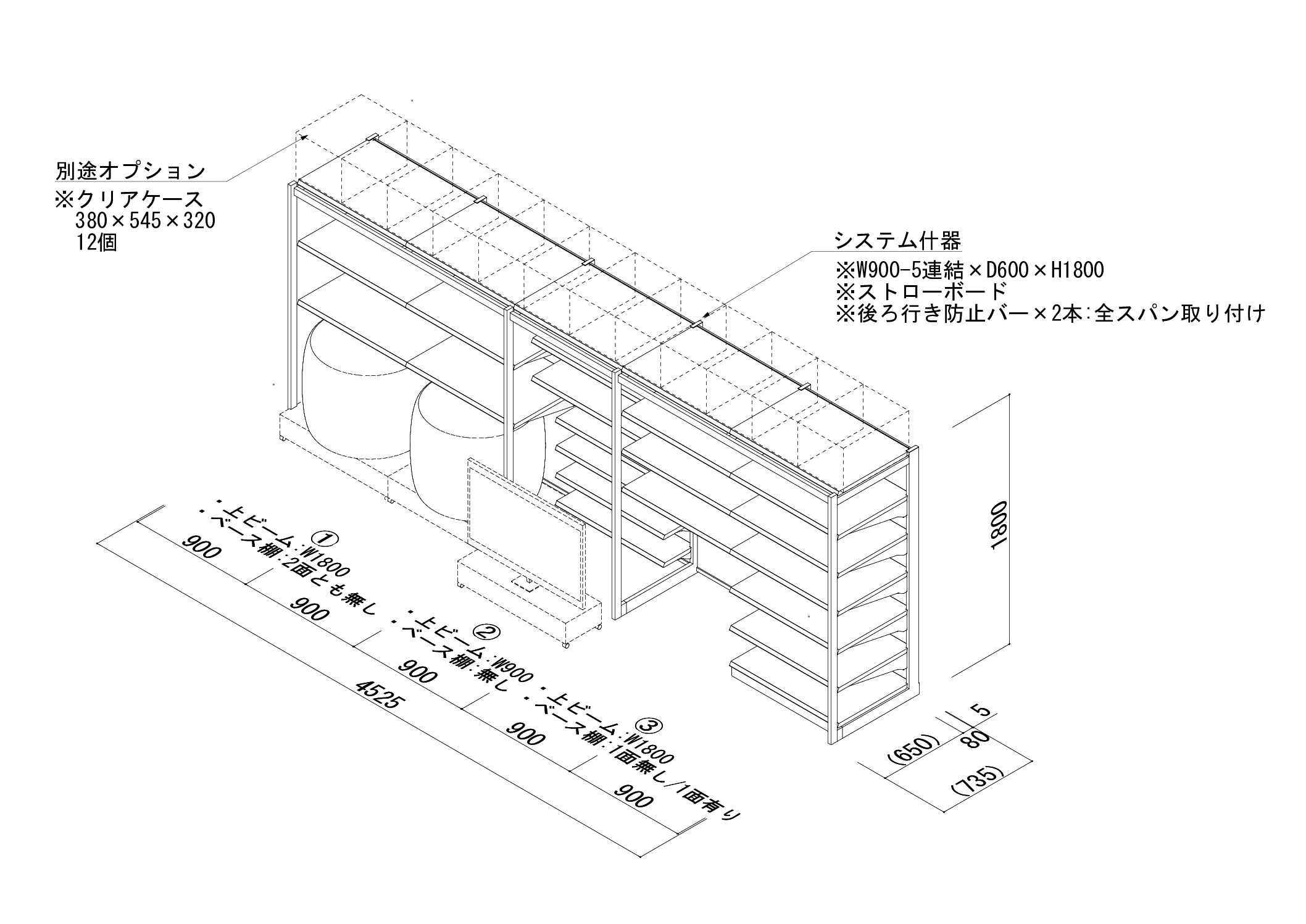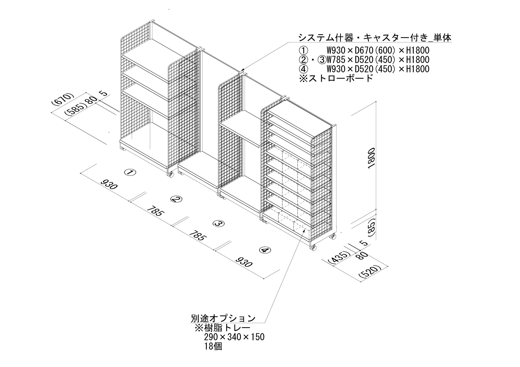 製品 前柱付き壁面什器_5連 & キャスター付き什器_4台 & 天板付き壁面什器_2連