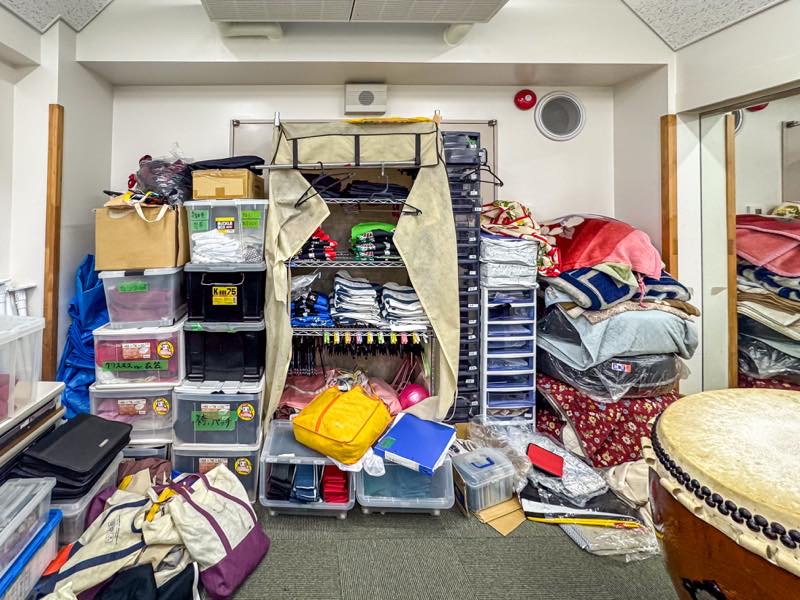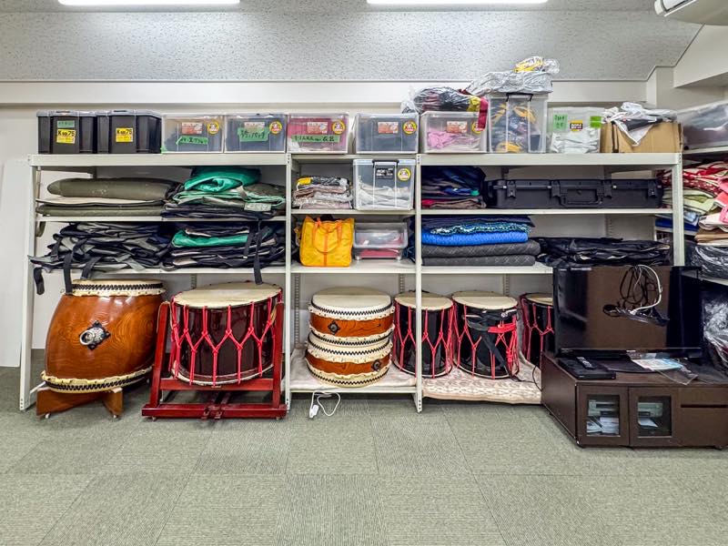 演技用のユニフォームなどの透明衣装ケースを什器最上段に収納して、太鼓の養生カバーも棚置きで種類別に管理可能に