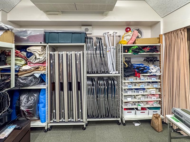 デコラテーブルやパイプ椅子を横積みから縦積み保管にして移動式にする事で掃除も取り出しも楽に