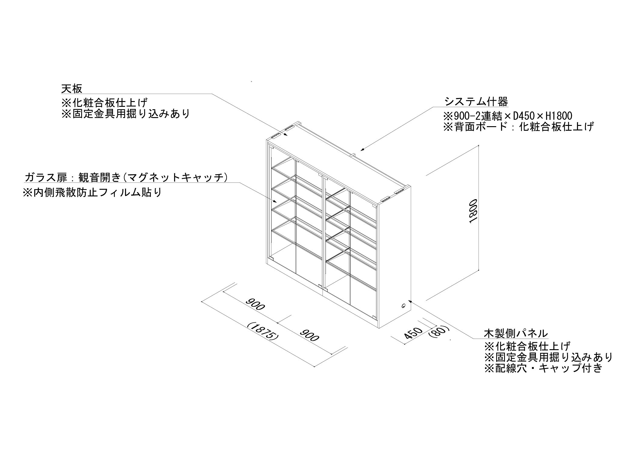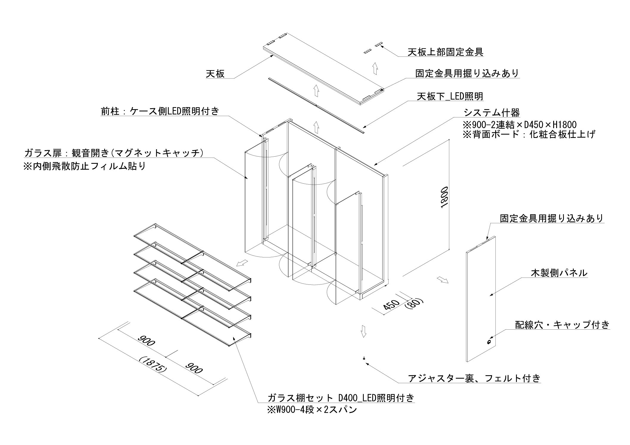 | 部材構成 | 付属オプション: 側板_W530×D1,800-左右1セット 天板・LED照明付き_W900×D450-2セット 前柱・LED照明付き_3セット(金具含む) ガラス扉・観音開き_W900-2セット ガラス棚セット_W900×D400-8セット 棚下照明_LED 1式 |